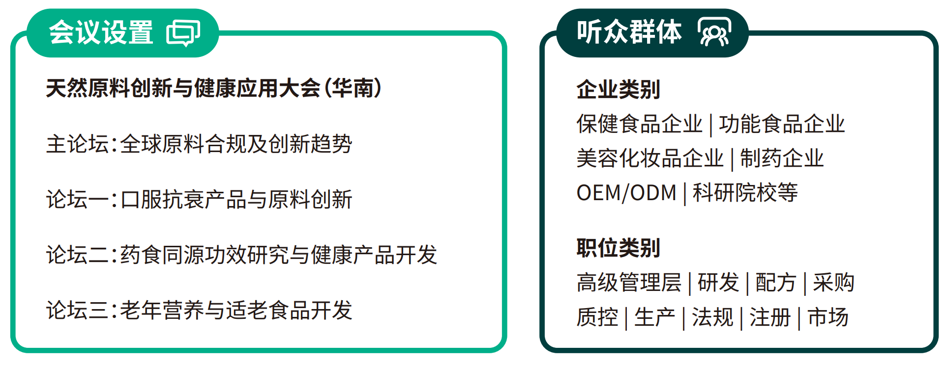 展区同期将携手多家知名机构举办天然原料创新与健康应用大会(华南)。大会将立足粤港澳大湾区 “双循环”枢纽的独特优势,邀请海内外知名专家大咖与行业领军者齐聚,分享最新科研成果,把脉全球 产业趋势,链接产学研优质资源。