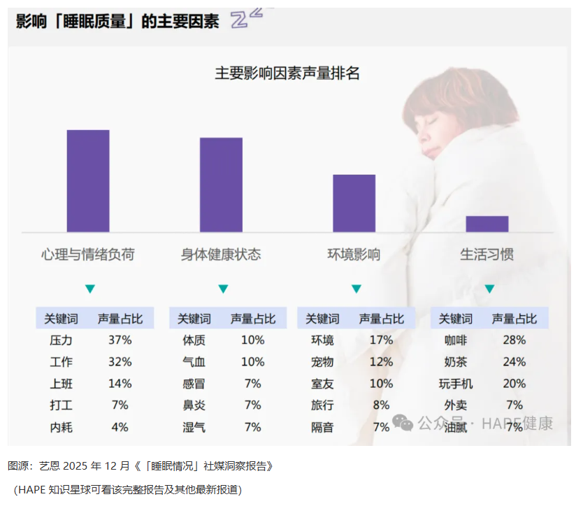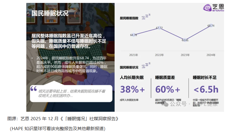 据艺恩 2025 年 12 月《「睡眠情况」社媒洞察报告》,中国超三成成年人受失眠困扰、超六成 90 后睡眠质量堪忧,推动智能床垫、睡眠监测等设备需求爆发,当前消费者对助眠产品的科学原理关注度持续提升,睡眠经济正从“被动改善”转向“主动管理”的科学化赛道。本文将从睡眠需求痛点切入,拆解主流干预产品的市场逻辑与产业链布局,为相关行业投资者、从业者、企业经营者及创业者提供系统性的参考。
