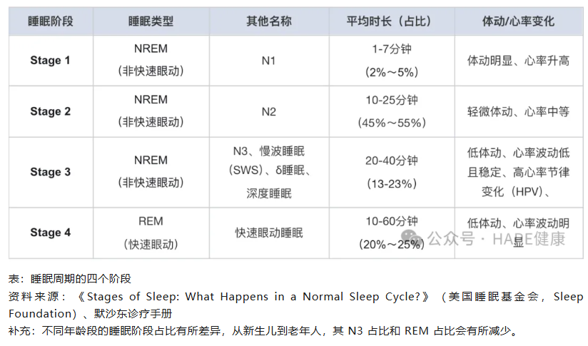 睡眠是人体身心恢复的自然过程,介于清醒与昏迷之间,意识活跃度降低、对外界刺激敏感度下降,同时伴随脑电波、眼球运动、肌肉张力、激素分泌等一系列规律性生理变化[1]。“睡眠-觉醒”周期调节的通路主要包括“觉醒系统”、“NREM和REM系统” [2],后者交替循环形成四个睡眠阶段(如下表),共同承担代谢废物清除、记忆巩固等核心生理功能 [3]。