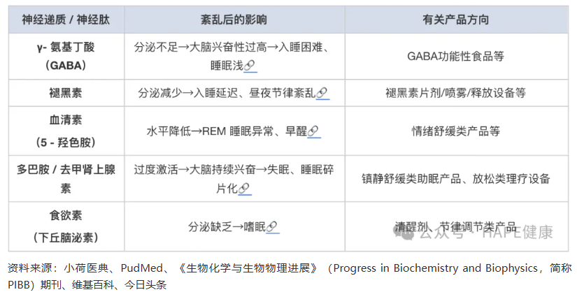 中枢神经递质的平衡直接影响睡眠的诱导、维持与觉醒,不同递质紊乱对应不同睡眠一定程度的影响,为产品成分选择、功能定位提供了参考依据。