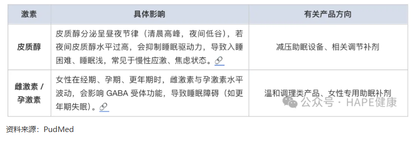 内分泌系统与睡眠调控密切相关,激素水平的波动会直接影响睡眠质量(如下表),为产品赛道提供切入点: