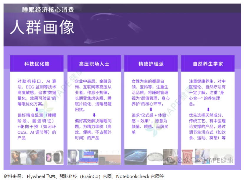 当前中国睡眠经济的核心消费群体已形成清晰的四大圈层,分别为科技优化族、高压职场人士、精致护理派、自然养生学家,这一群体划分也得到了 Flywheel 飞未相关统计数据的佐证。四大群体的需求痛点与消费偏好差异显著,为企业精准布局赛道、打造差异化产品提供了明确方向: