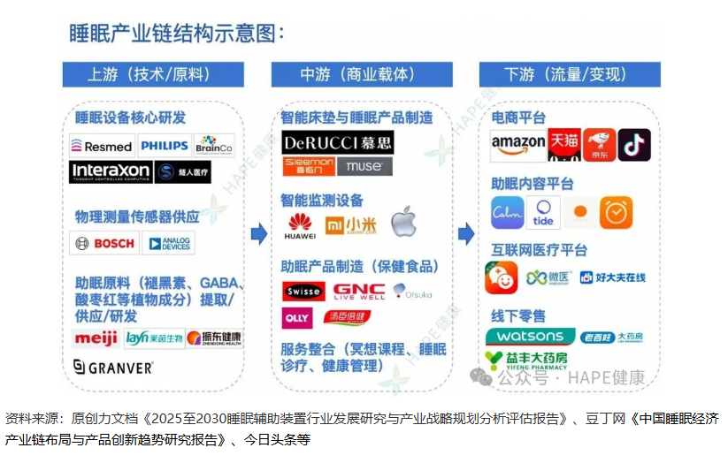 前文已分析睡眠各细分赛道,本节将进一步归整睡眠干预的完整产业链结构(上–中–下游),助力行业人员全面把握产业生态、关键参与者及合作机会 [7]。